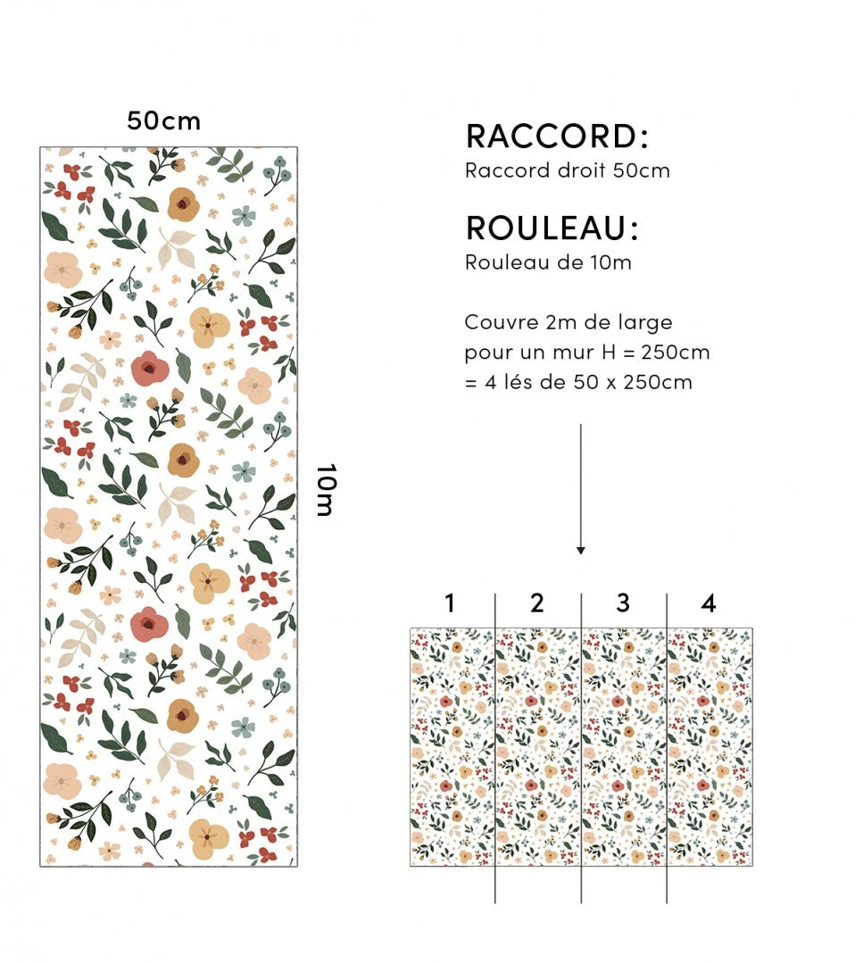 - 1x rouleau de 2 m x 2,48 m pour réaliser 4 lés 50 cm x 10 m / Raccord droit : 50 cm.
