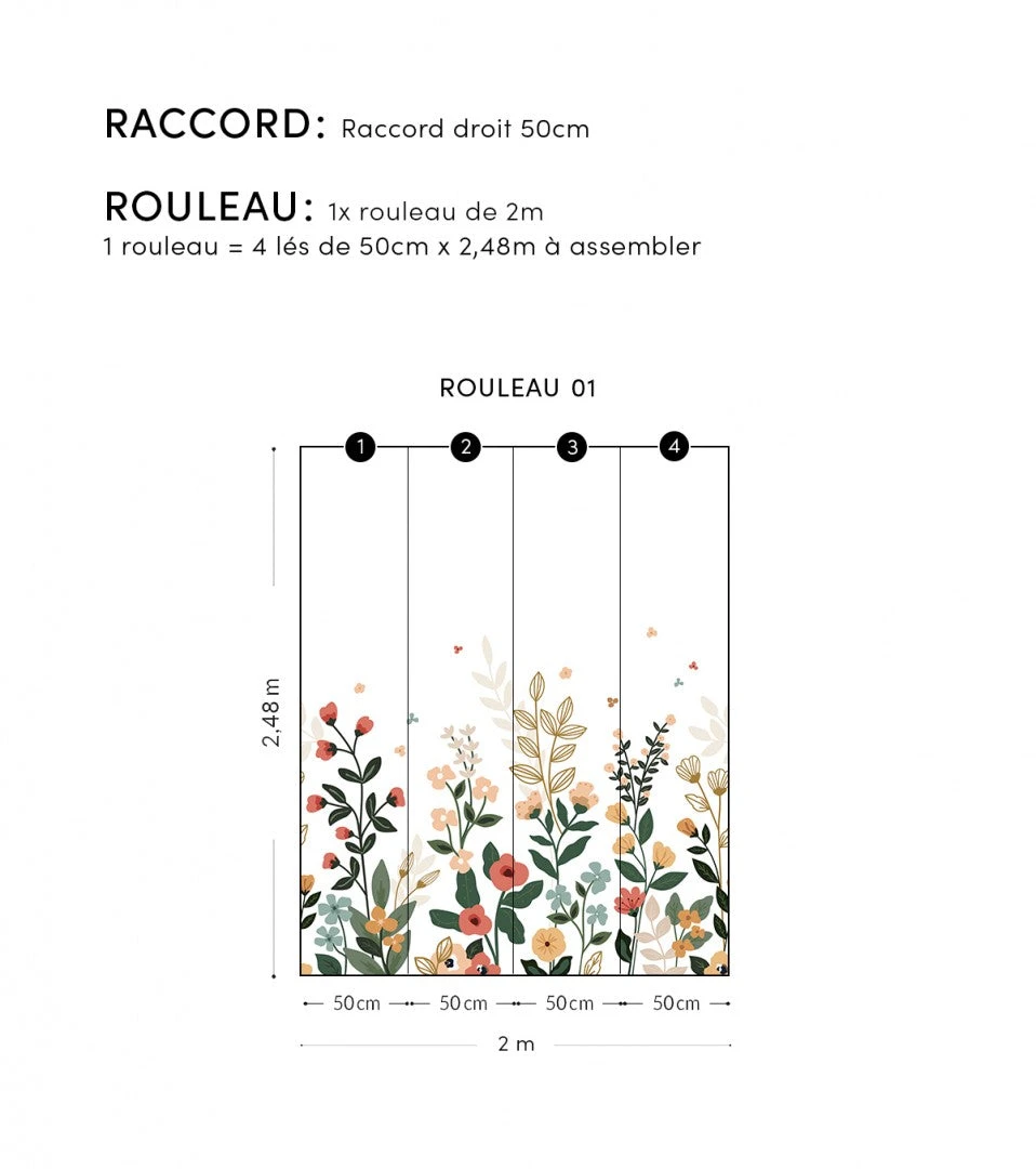 1x rouleau de 2 m x 2,48 m pour réaliser 4 lés 50 cm x 10 m / Raccord droit : 50 cm.