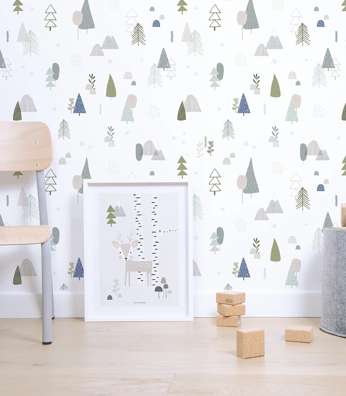 Papier peint motif forêt nordic.Papier peint intissé, l’intissé est un matériau haut de gamme à mi-chemin entre le papier et le tissu. Se pose avec de la colle pour intissé, à appliquer sur le mur. Votre besoin en papier peint Dimension rouleau : l.50cm (largeur) L.10m (longueur). Raccord dans la hauteur : raccord droit 50 cm – Si la hauteur de votre mur est comprise entre 2m et 2,5m, alors vous pouvez couvrir 2m linéaires avec un rouleau. Soit 4 lés de 2m50x50cm. – Si la hauteur de votre mur est comprise entre 2,5m et 3m, alors vous pouvez couvrir 1,5 m linéaire avec un rouleau. Soit 3 lés de 3mx50cm. À savoir Important, mieux vaut bien calculer votre besoin et prévoir 10% de +. Vos commandes sont imprimées sur mesure afin d’éviter qu’il n’y ait pas de différence de bain. C’est-à-dire une légère variation de teinte entre les lés. Papiers peints édités à la commande.Informations produitMatière : 100% papier peint intissé,Fourni avec conseils de pose,Fabriqué en France,Euroclass B,Certification A+.