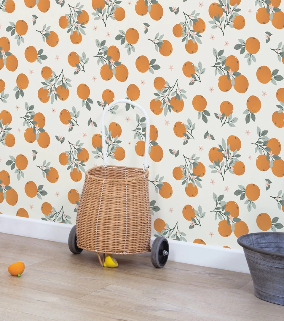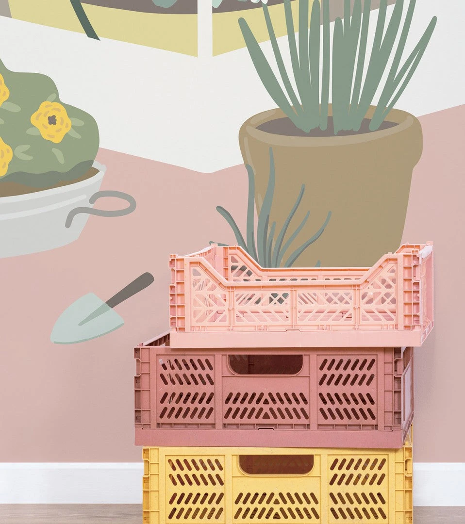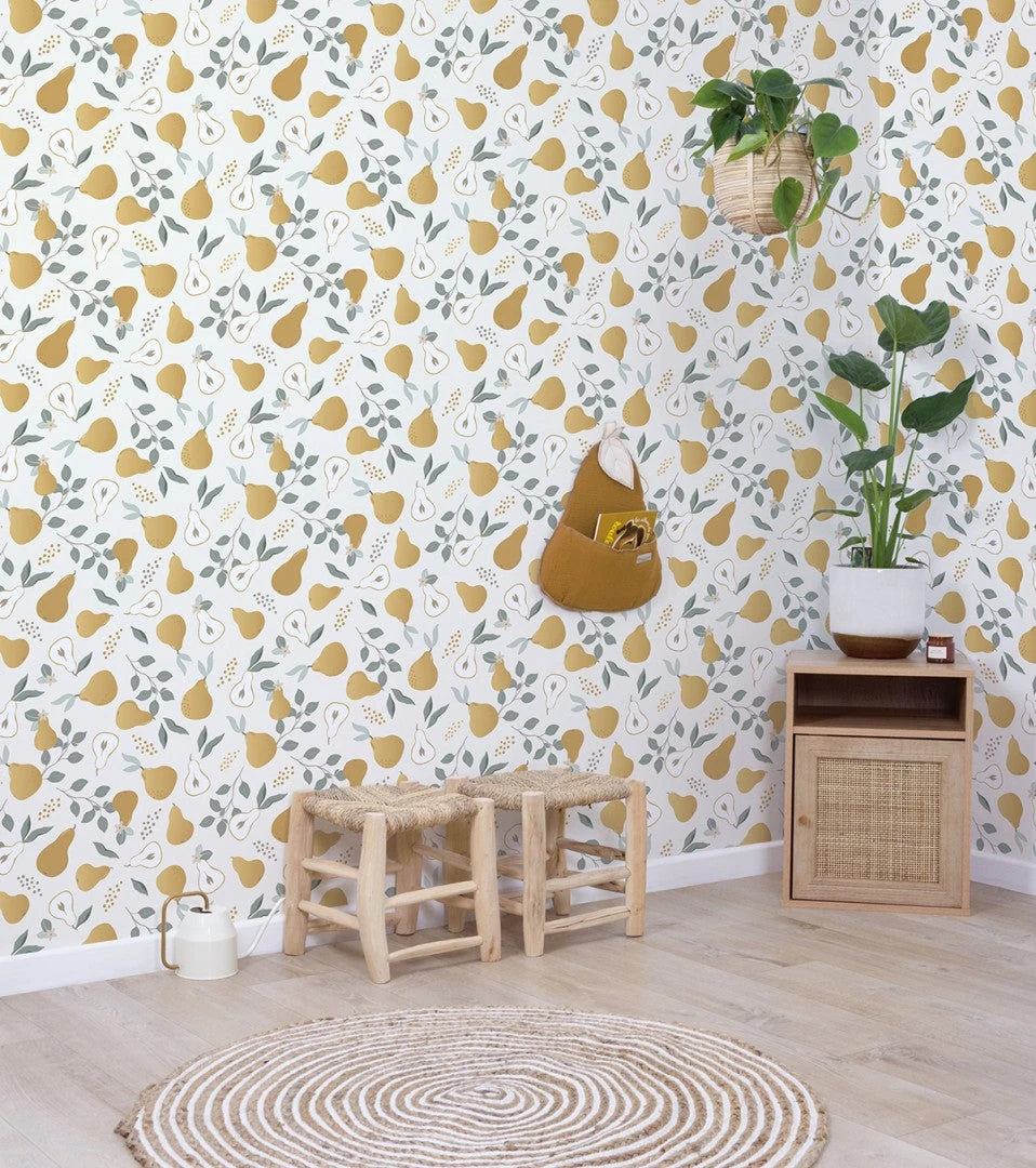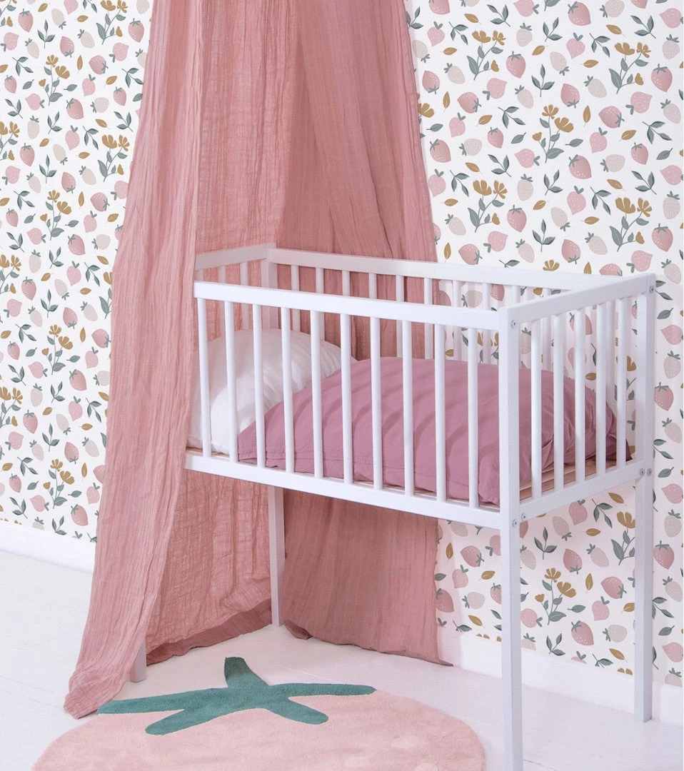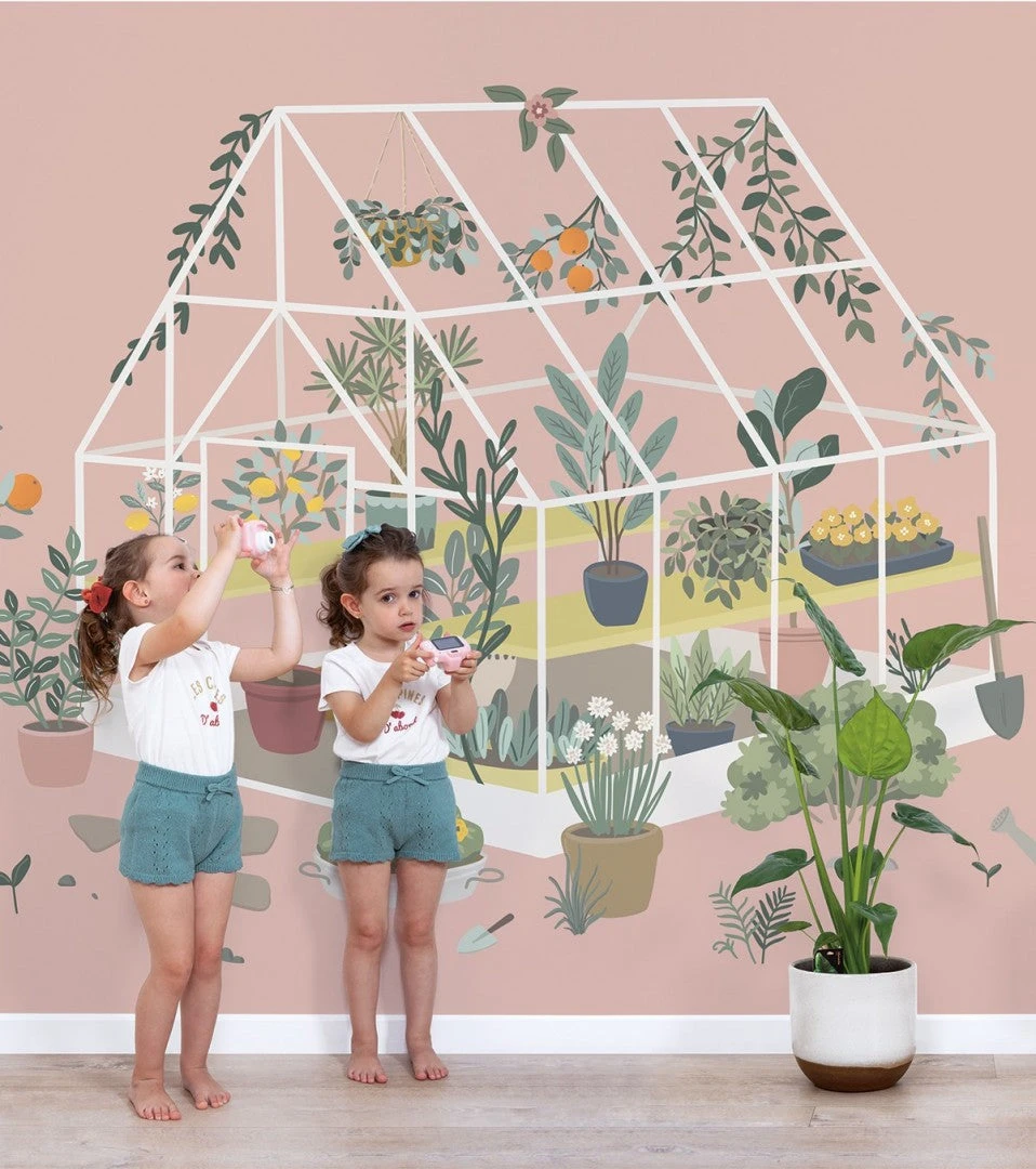 Découvrez les papiers peints Lilipinso ! Louise présente à votre enfant la serre et ses plantes et fruits. Vous avez également le papier peint à motif fraises.