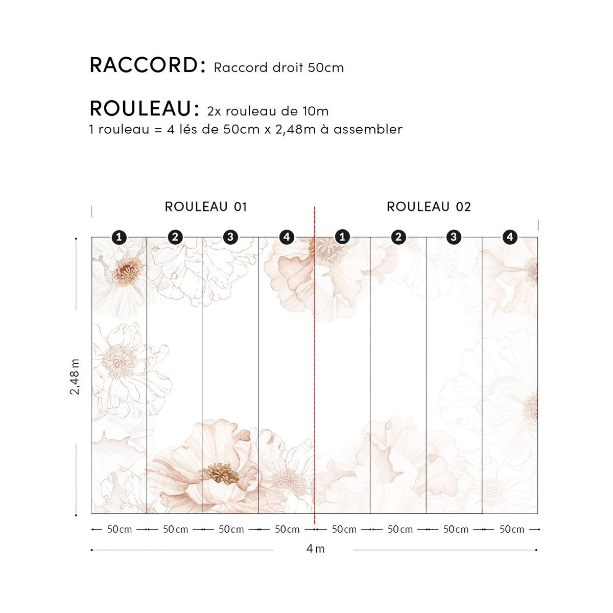 Chaque rouleau contient 4 panneaux de 50x248cm à assembler ensemble (panneau 1 à 4)
