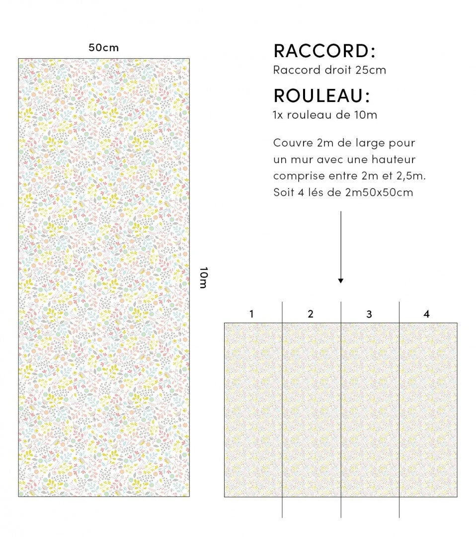 Le calcul du nombre de rouleaux varie en fonction du papier peint choisi et de son type raccord (droit ou sauté), c’est-à-dire lorsque les motifs se chevauchant d’un lé sur l’autre.