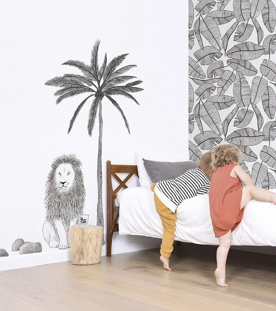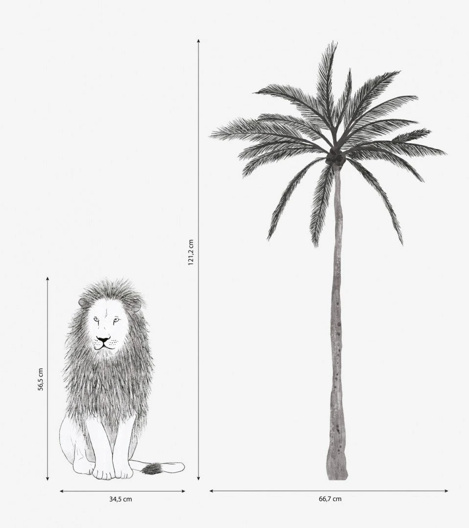 Découvrez ce sticker Serengeti avec un lion et un palmier. Il est en vinyle mat avec blanc de soutien, qui permet à votre sticker de ne pas être transparent. Vous pourrez donc poser le sticker sur un mur de couleur sans altérer la couleur du sticker.