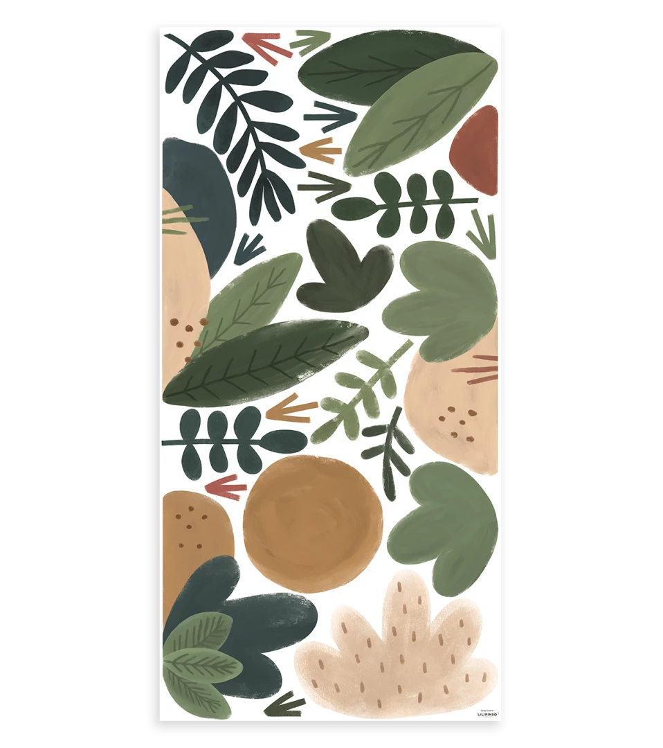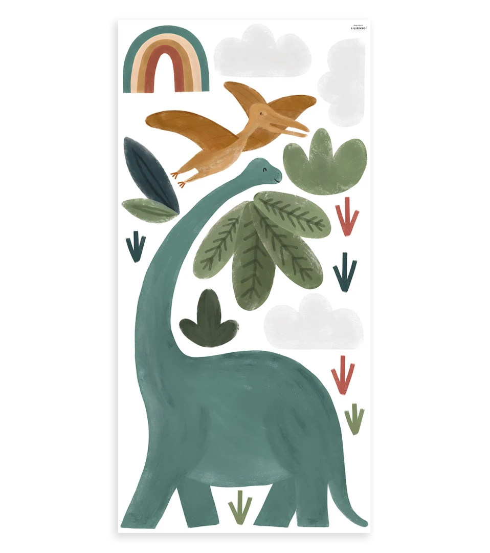 Stickers Plantes et dinosaure en vinyle mat avec blanc de soutien, qui permet à votre sticker de ne pas être transparent. Vous pourrez donc poser le sticker sur un mur de couleur sans altérer la couleur du sticker. Dimensions : 64 cm x 130 cm.