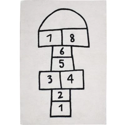 Caractéristiques techniques : – Marelle numérotée de 1 à 8.- Tapis 100% coton.Conseils d’entretien :- Aspirer sans frotter.- Eviter de brosser.- Pour un nettoyage en profondeur, s’adresser à un professionnel.- Eviter les expositions prolongées au soleil pour préserver les couleurs.Age conseillé :